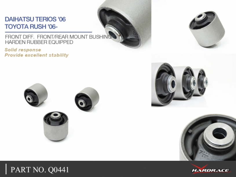 Harden rubber bushing made with high strength and anti-crack rubber material, solid steering response and driving suspension feel, resist side inclined while cornering at high speed maneuvers . Reduces vibration . Provides stability . OEM direct replacement . Regular greasing not required . No noise or squeaks