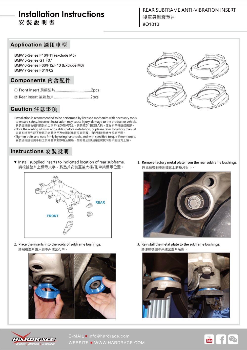 Hardrace subframe anti-vibration insert is the best choice to improve traction and get a more connected suspemsion feedback. The insert features CNC aluminum alloy construction for precise fitment to the factory subframe bushings. By filling the void in the bushings, the inserts capably limit unwanted movement and firming up the subframe, eliminating wheel hop, power loss and sloppy suspension feel under harsh driving conditions.