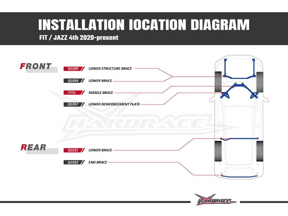 HARDRACE is proud to announce the new front lower brace for the 4th gen Fit/Jazz. This will reduce vehicle chassis flex and deflection to increase the rigidity of your car under high speed driving and hard cornering, resulting in better and quicker handling response.