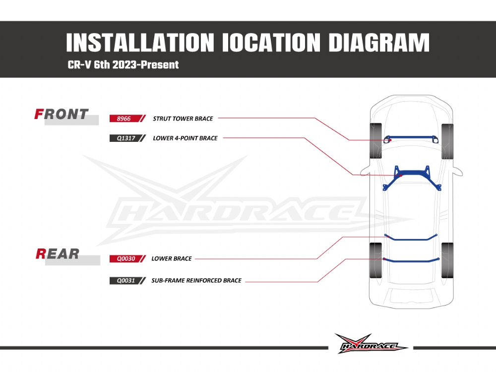HARDRACE is proud to announce the new front lower 4-point brace for CR-V. This brace will reduce vehicle chassis flex and deflection to increase the rigidity of your car under high speed driving and hard cornering, resulting in better and quicker handling response.