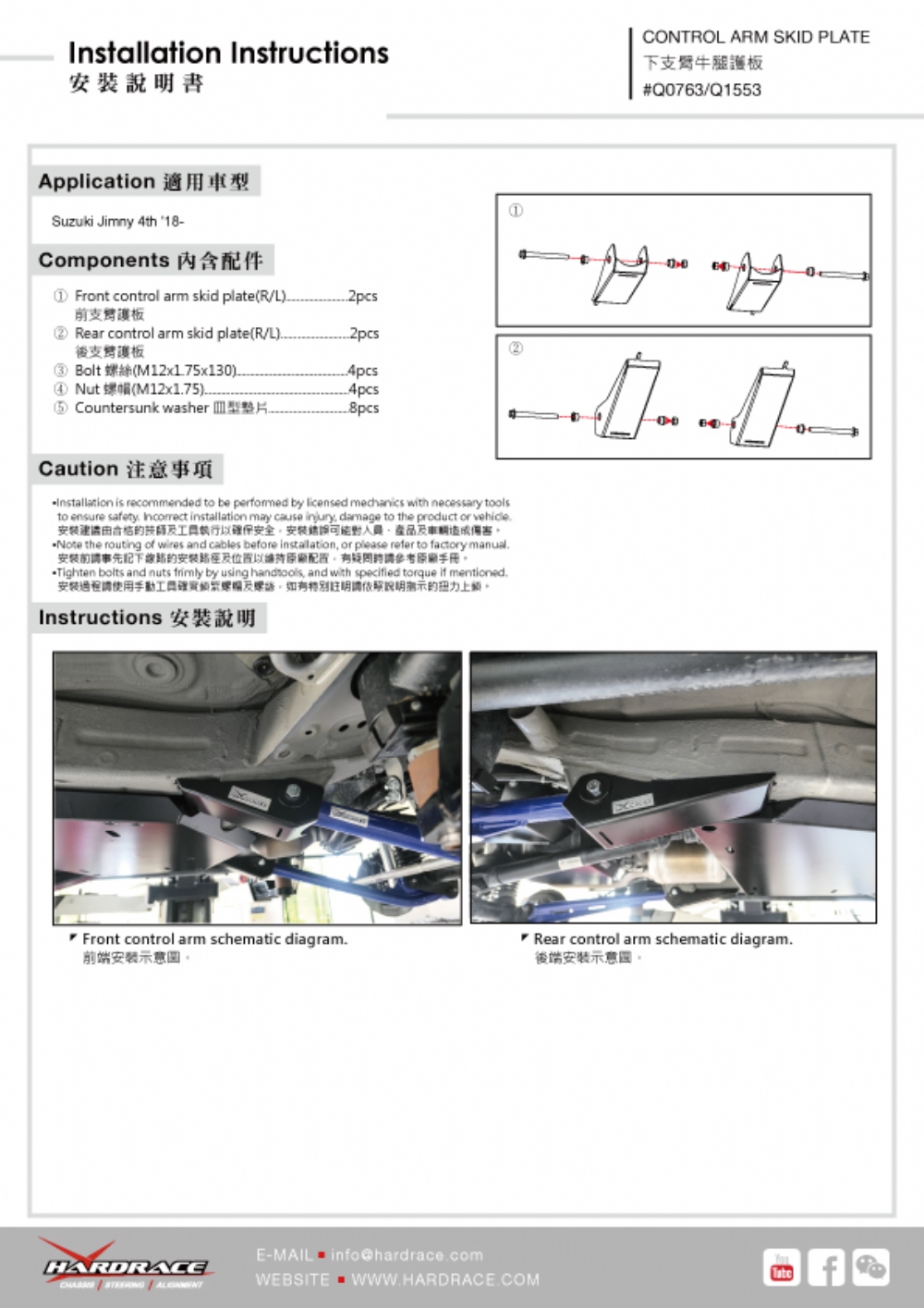 Hardrace control arm/ radius arm skid plates offer ultimate underbody protection to your Jimny. The shields are constructed from ED coated high strength steel to provide superior strength and durability, preventing damages to the control arm/ radius arm mounting brackets while off-roading. The shields bolt into existing factory mounting holes and there is no drilling required for installation.
