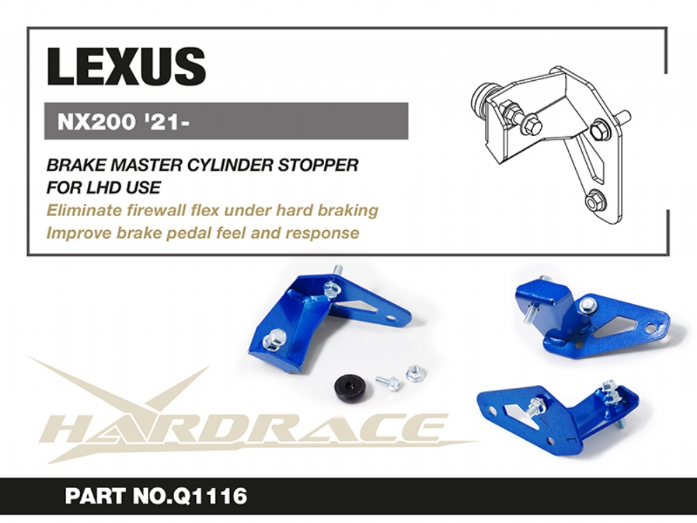 Hardrace is proud to announce the brake master cylinder stopper for LEXUS NX. It reduces deflection at the firewall during heavy braking, making the brake pedal feel stiffer and more responsive.